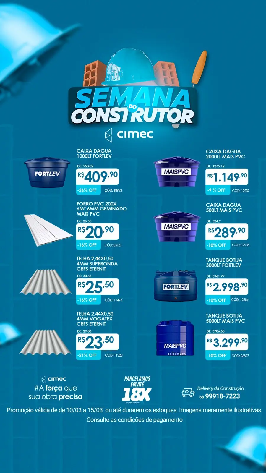 A Cimec está promovendo a Semana do Construtor, uma ação especial para quem busca materiais de construção com preços promocionais. A campanha acontece entre os dias 10 e 15 de março, oferecendo descontos em itens como caixas d’água, telhas, forros de PVC e tanques de armazenamento.