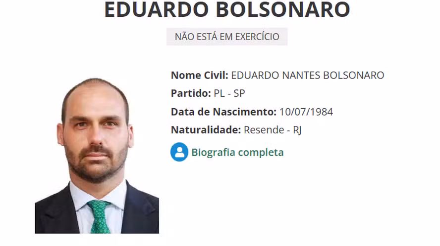 Dois dias após anunciar que irá tirar licença do seu mandato na Câmara dos Deputados, o deputado federal Eduardo Bolsonaro aparece agora como fora de exercício do cargo no site oficial da casa. Ainda não se sabe quem será o suplente e o mesmo site da Câmara também não traz a informação. A expectativa é que seja o segundo suplente, ex-deputado federal José Olímpio.