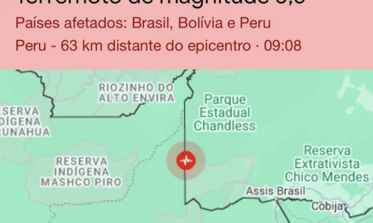 Um terremoto de magnitude 5,6 foi registrado na fronteira entre Brasil e Peru na manhã desta terça-feira (11), de acordo com o Centro Alemão de Pesquisa em Geociências (GFZ). O abalo sísmico ocorreu a uma profundidade de 658 km, o que pode ter reduzido seu impacto na superfície.