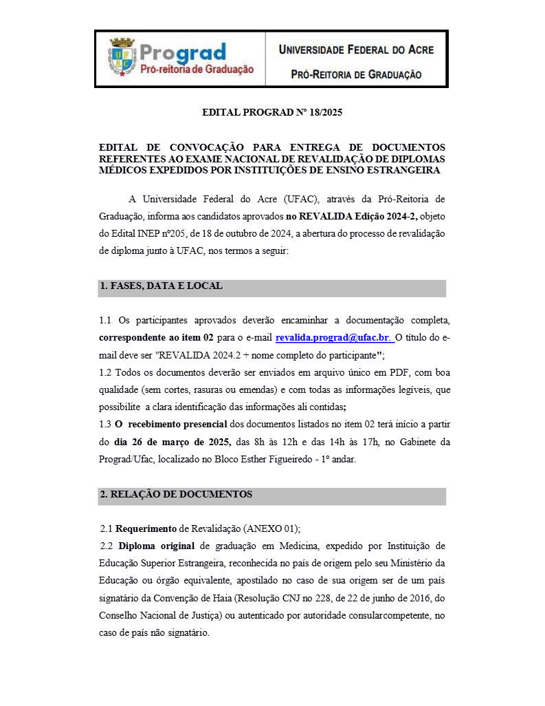 A Universidade Federal do Acre (Ufac) publicou, nesta terça-feira (25), o Edital Prograd nº 18/2025, convocando os médicos aprovados no Exame Nacional de Revalidação de Diplomas Médicos Expedidos por Instituições de Ensino Estrangeiras (Revalida) – edição 2024.2, para a entrega da documentação necessária ao processo de revalidação.