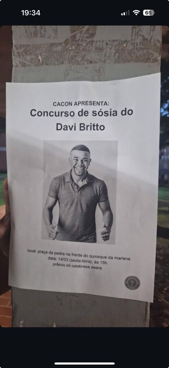 Os estudantes da Universidade Federal do Acre (UFAC) organizam uma divertida competição de sósias do influenciador Davi Brito, marcada para esta sexta-feira (14), às 15h, na Praça da Pedra, em frente ao Quiosque da Marlene, nas dependências do campus Rio Branco.
