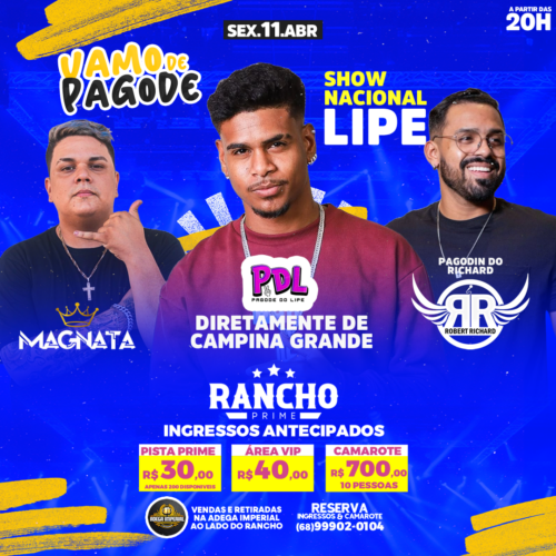 A noite do dia 11 de abril já tem destino certo: o Rancho Prime vai ferver com uma super festa que promete agitar a fronteira! A atração principal é o show nacional de Pagode do Lipe, que chega com aquele som envolvente que todo mundo ama cantar junto. Chame os amigos, prepare o look e venha curtir uma noite de muita música, gente bonita e alto astral. Vai ser daquelas que ficam pra história! 🍻✨
