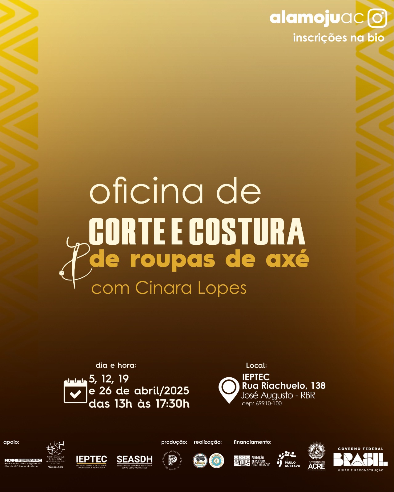 O Alamoju Centro de Cultura e Pesquisa promove, em abril, duas oficinas gratuitas voltadas para costura e música. As atividades acontecem em Rio Branco e buscam incentivar a valorização e o desenvolvimento de saberes tradicionais.