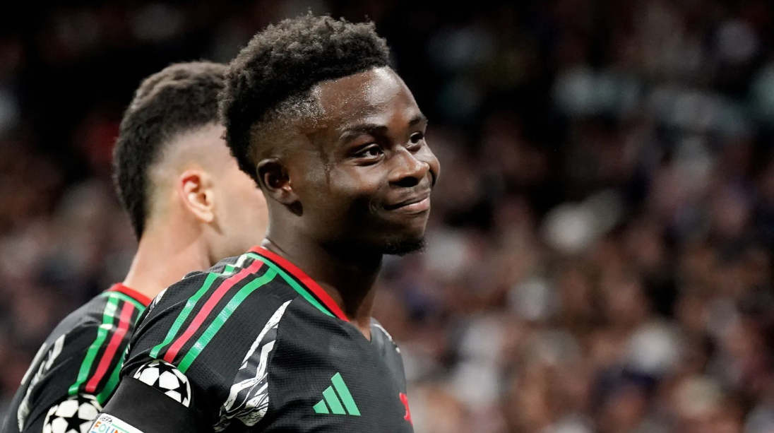 Saka comemorando gol do Arsenal sobre o Real Madrid no Santiago Bernabéu pela Champions • Reprodução/X/Champions League