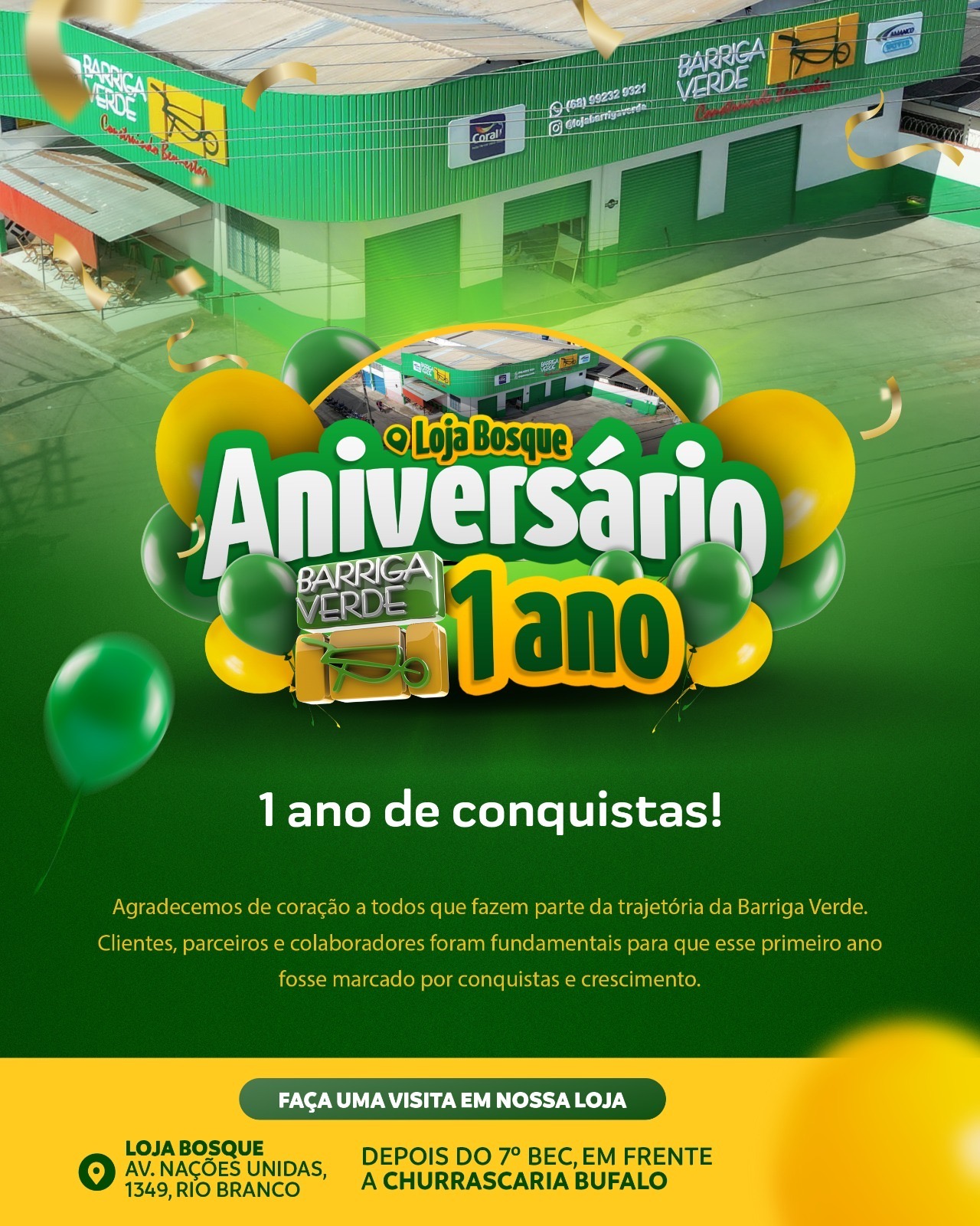 Nesta semana, a loja Barriga Verde localizada no Bosque comemorou seu primeiro ano de funcionamento. Inaugurada em 2024, a unidade situada na Av. Nações Unidas, 169, é a 4ª loja do Grupo Barriga Verde no Acre e faz parte da sólida trajetória da empresa, que, desde 1986, é uma das maiores redes de material de construção da região Norte, com presença também em Porto Velho, Rondônia.