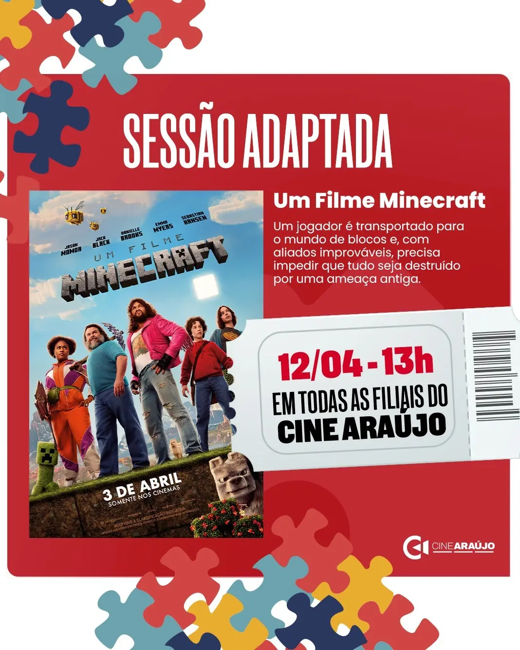 E tem programação especial para a criançada e toda a família: no sábado, dia 13 de abril, às 13h, o Cine Araújo realiza mais uma edição do Cine Adaptado, com exibição do filme Minecraft. A sessão é preparada especialmente para pessoas com Transtorno do Espectro Autista (TEA) e suas famílias, com ambiente adaptado, som mais baixo, luzes levemente acesas e total liberdade para curtir o filme com conforto e acolhimento.