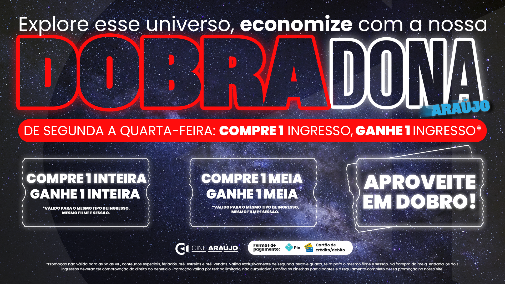 Vale lembrar que crianças a partir de dois anos já pagam ingresso, conforme a política do cinema. O regulamento da promoção pode ser alterado a qualquer momento pelo Cine Araújo, por isso é importante consultar a disponibilidade e os detalhes diretamente nas bilheterias antes da compra.