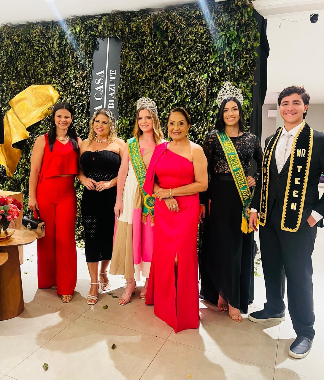 Coordenadora Meire Manaus cm os jurados, jornalista Aline Rocha, radialista Degeane Santos, Miss Acre Mirim 2019-Beatriz Almeida, Mister Brasil Mundial 2021-Kayk Amorim e a Miss Acre Terra 2024-Maia Clara Correia.