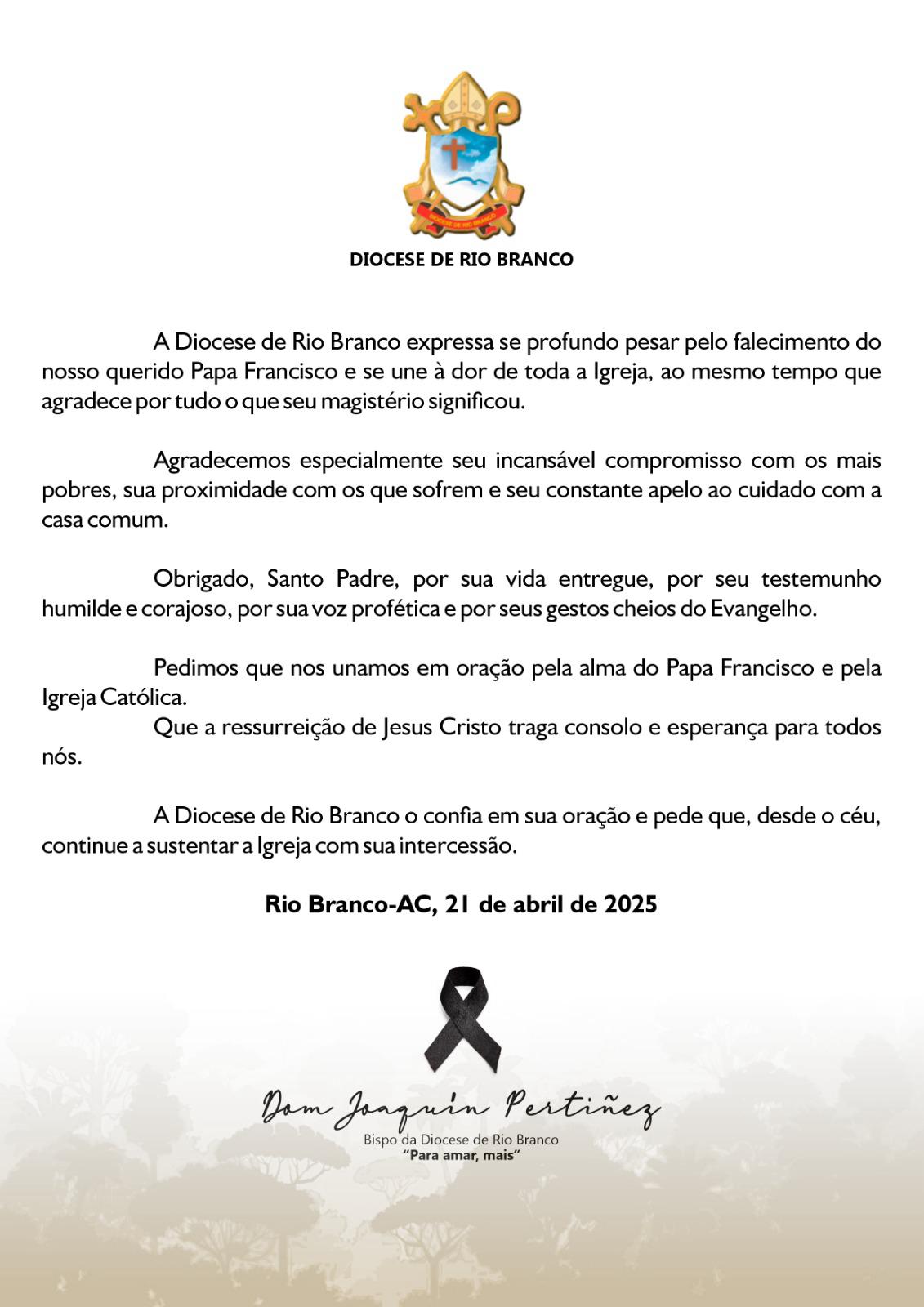 A Diocese de Rio Branco emitiu uma nota oficial nesta segunda-feira (21) manifestando profundo pesar pelo falecimento do Papa Francisco. Na mensagem, assinada pelo bispo Dom Joaquín Pertíñez, a diocese se solidariza com a dor da Igreja Católica em todo o mundo e agradece pelo legado deixado pelo pontífice.