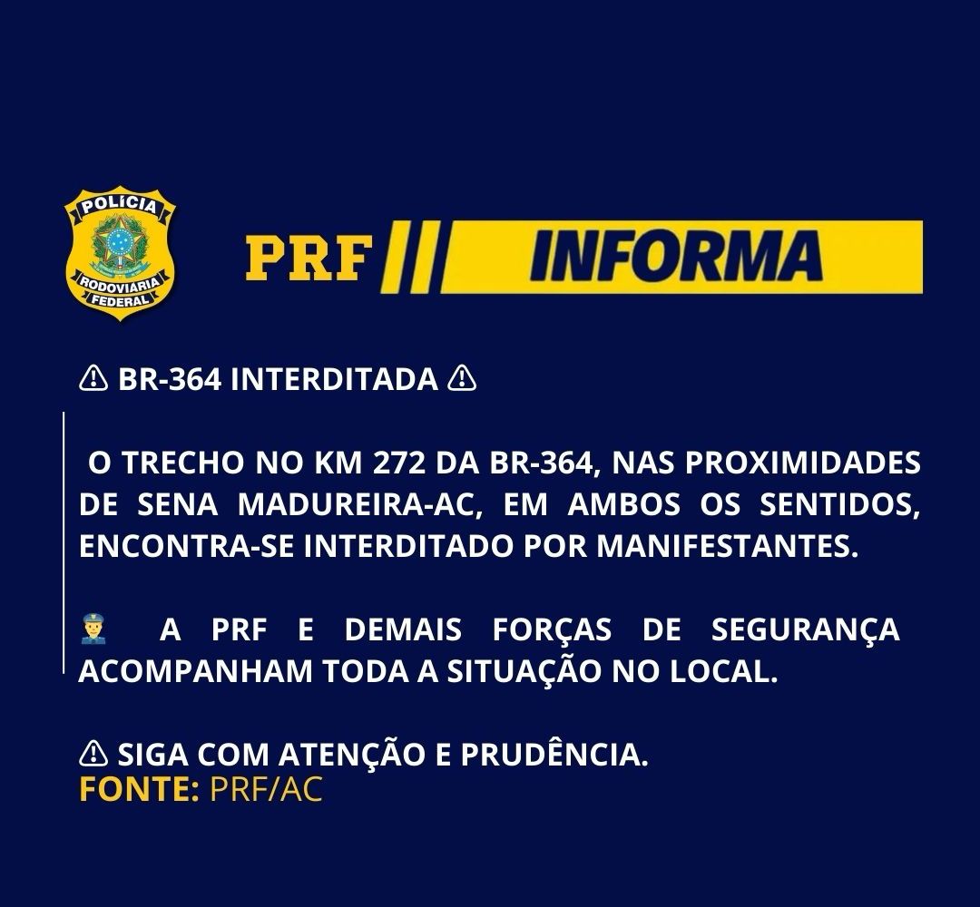 A Polícia Rodoviária Federal (PRF) informou nesta quarta-feira (9) que o trecho localizado no km 272 da BR-364, nas proximidades do município de Sena Madureira (AC), está completamente interditado nos dois sentidos devido à presença de manifestantes.