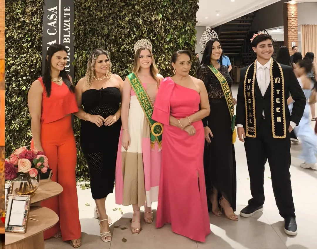 Referência em concursos de beleza, a promoter Meyre Manaus realizou no domingo, 13, no Gran Reserva, a grande final do Concurso Miss e Mister Mirim Universo. Em breve, os representantes acreanos estarão brilhando nas passarelas nacionais. Na foto, Meyre Manaus com os jurados: as jornalistas Aline Rocha e Degeane Santos, as misses Beatriz Almeida e Clara Correia e o Mister Acre Kayk Amorim.