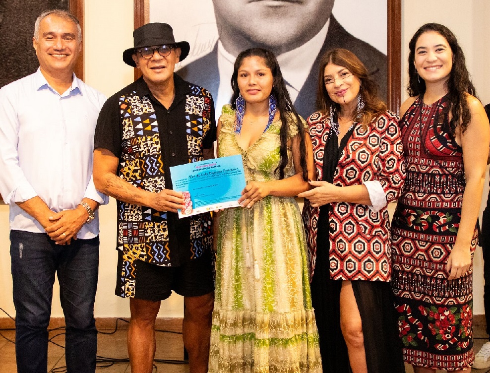 O palestrante Moisés Alencastro entregou o certificado à indígena Aline Shanenawa