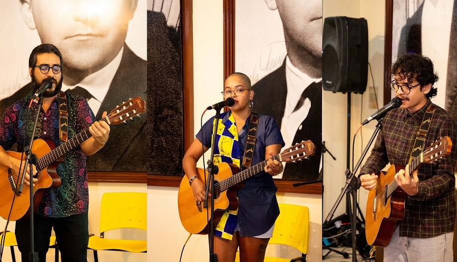 Os músicos Diogo Soares (E), Maya Dourado (C) e Carlinhos Hofre (D) encantaram os presentes