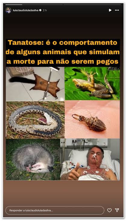 Um dos filhos do presidente Luiz Inácio Lula da Silva (PT) compartilhou um meme, neste domingo, 20, em que em que compara o ex-mandatário Jair Bolsonaro (PL) a um animal que se finge de morto para não ser pego.