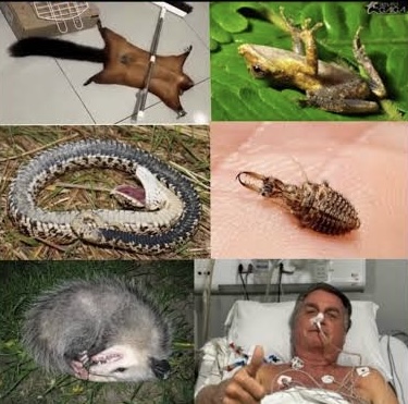 Na imagem, há ainda a explicação de que, nos animais, esse comportamento é chamado de tanatose. Uma rã, cobra e outros bichos aparecem ao lado de uma foto do ex-presidente internado, com aparelhos acoplados a ele.