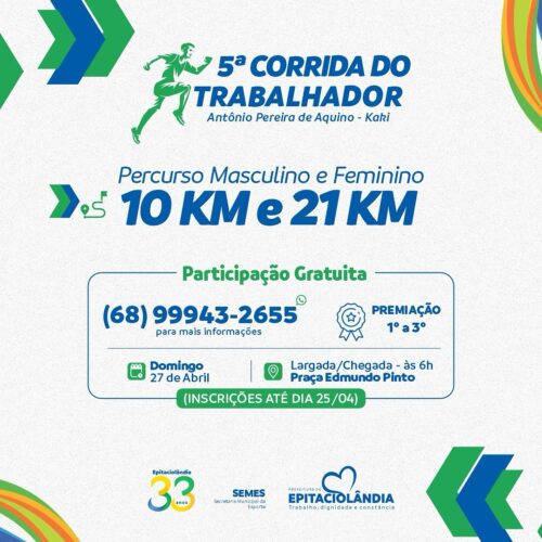 Como parte das comemorações pelo Dia do Trabalhador, a Prefeitura de Epitaciolândia realiza no próximo dia 27 de abril a aguardada 5ª edição da Corrida do Trabalhador!
