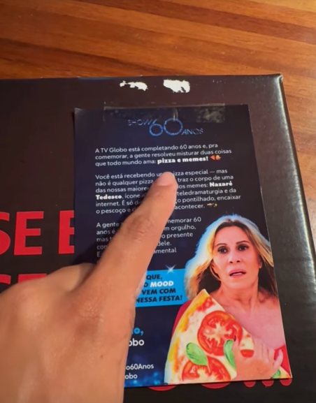 Além de ser uma homenagem direta à Globo, a caixa de pizza traz uma alusão ao famoso meme de Nazaré Tedesco, personagem de Renata Sorrah, de “Senhora do Destino”, que viralizou na internet. A pizza foi entregue com um toque de humor, fazendo referência à imagem de desespero e perigo da personagem, que foi retratada em várias piadas da internet.