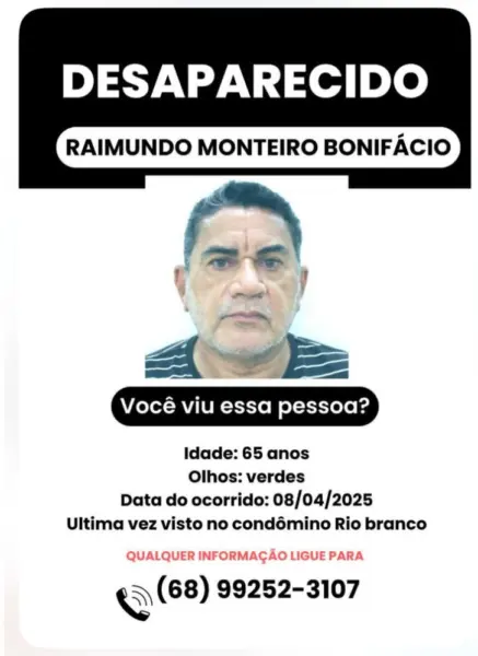 Informações sobre o paradeiro de Raimundo podem ser repassadas pelo telefone (68) 99252-3107.