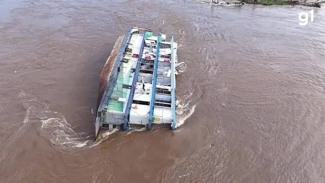 Através das imagens de cima é possível ver apenas uma parte do barco. A embarcação, que custou cerca de R$ 4 milhões, aparece tombada, com grande parte da estrutura já encoberta pelo rio (veja acima).