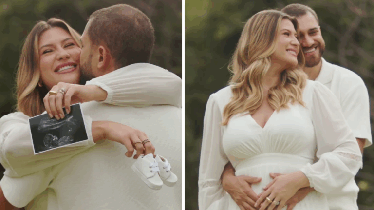 Nas imagens, a influenciadora, que possui quase quatro milhões de seguidores no Instagram, aparece ao lado do marido, com uma foto do ultrassom do bebê e um sapatinho.