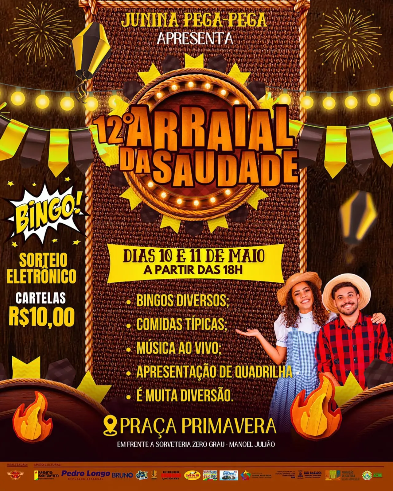 O 12º Arraial da Saudade é uma realização da Junina Pega-Pega e conta com o apoio cultural do Instituto Junina Pega-Pega, Deputada Federal Meire Serafim, Deputado Estadual Pedro Longo, Vereador Bruno Moraes, Sorveteria Zero Grau