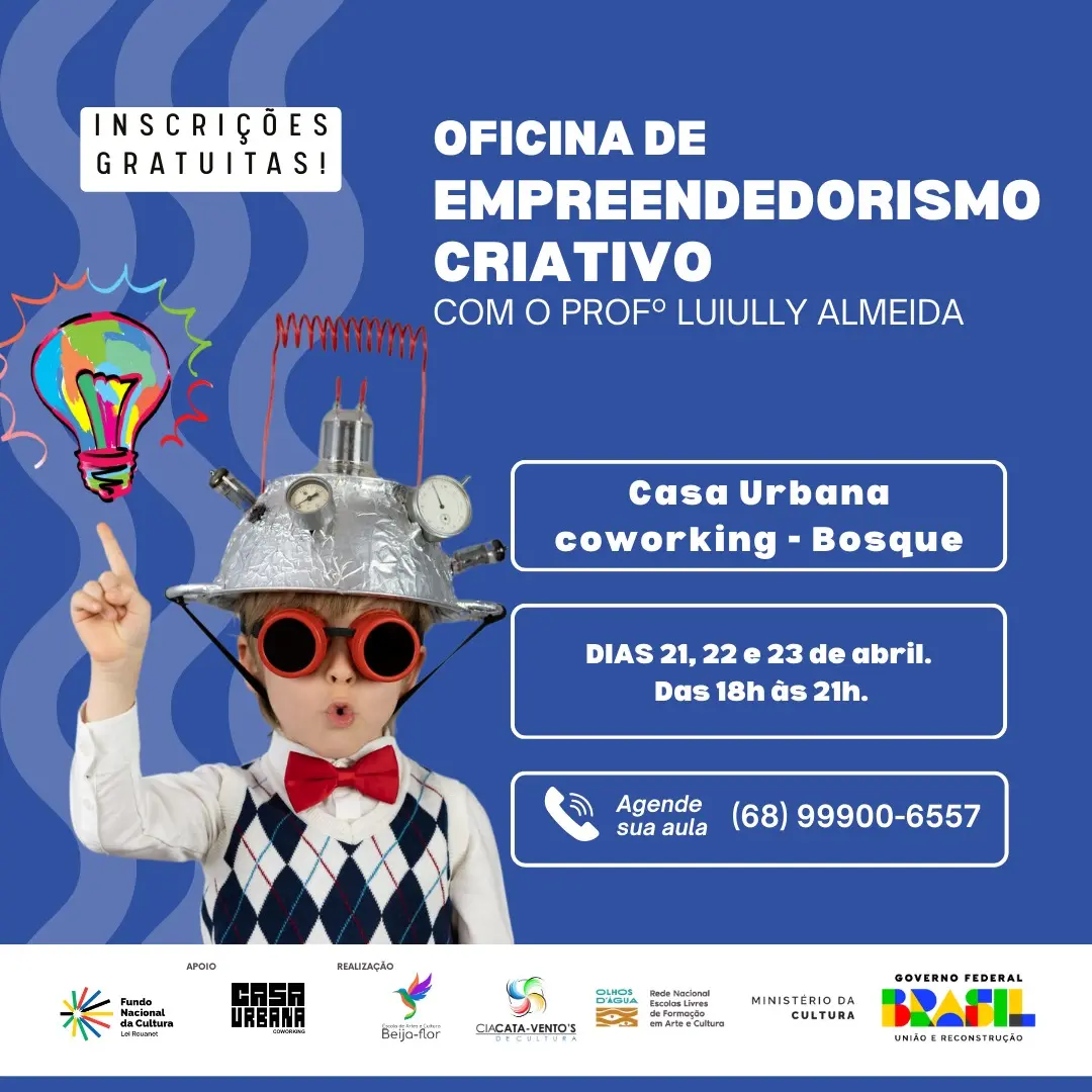 Com o professor LuiuIly Almeida, a oficina acontece na Casa Urbana Coworking nos dias 15, 16 e 17 de abril, das 18h às 21h. A proposta é explorar conceitos e estratégias para estimular a criatividade e inovação nos negócios. Agendar aula: (68) 99900-6557.