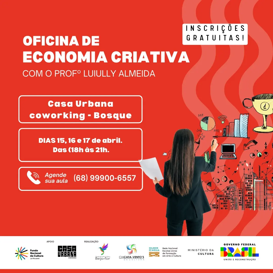 Também com o professor LuiuIly Almeida, a oficina acontece na Casa Urbana Coworking nos dias 21, 22 e 23 de abril, das 18h às 21h. O objetivo é capacitar os participantes para desenvolverem negócios sustentáveis com base na criatividade. Agendar aula: (68) 99900-6557.