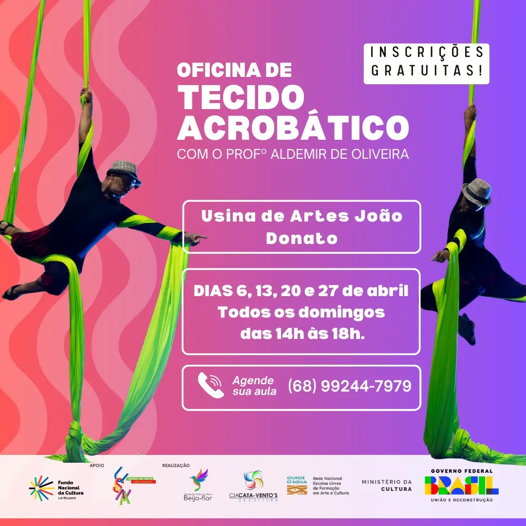 “São 100 oportunidades que você pode agarrar! Estamos anunciando a abertura de mais de 100 vagas em oficinas culturais gratuitas neste mês de abril, um projeto possível graças ao apoio do Ministério da Cultura. Nosso objetivo é proporcionar aprendizado e desenvolvimento artístico para a comunidade, fortalecendo não só a cultura, mas também a economia criativa do Acre – afinal, a cultura e o turismo cultural podem se tornar motores essenciais para o desenvolvimento econômico da nossa região. Estamos de portas abertas para parcerias, apoiadores e patrocinadores que queiram se unir a nós nesta iniciativa transformadora. Inscreva-se, participe e venha construir conosco um ambiente cultural ainda mais forte, vibrante e acessível, beneficiando tanto os artistas quanto toda a população, e juntos vamos colocar o Acre no mapa como um polo cultural de destaque”, pontua.