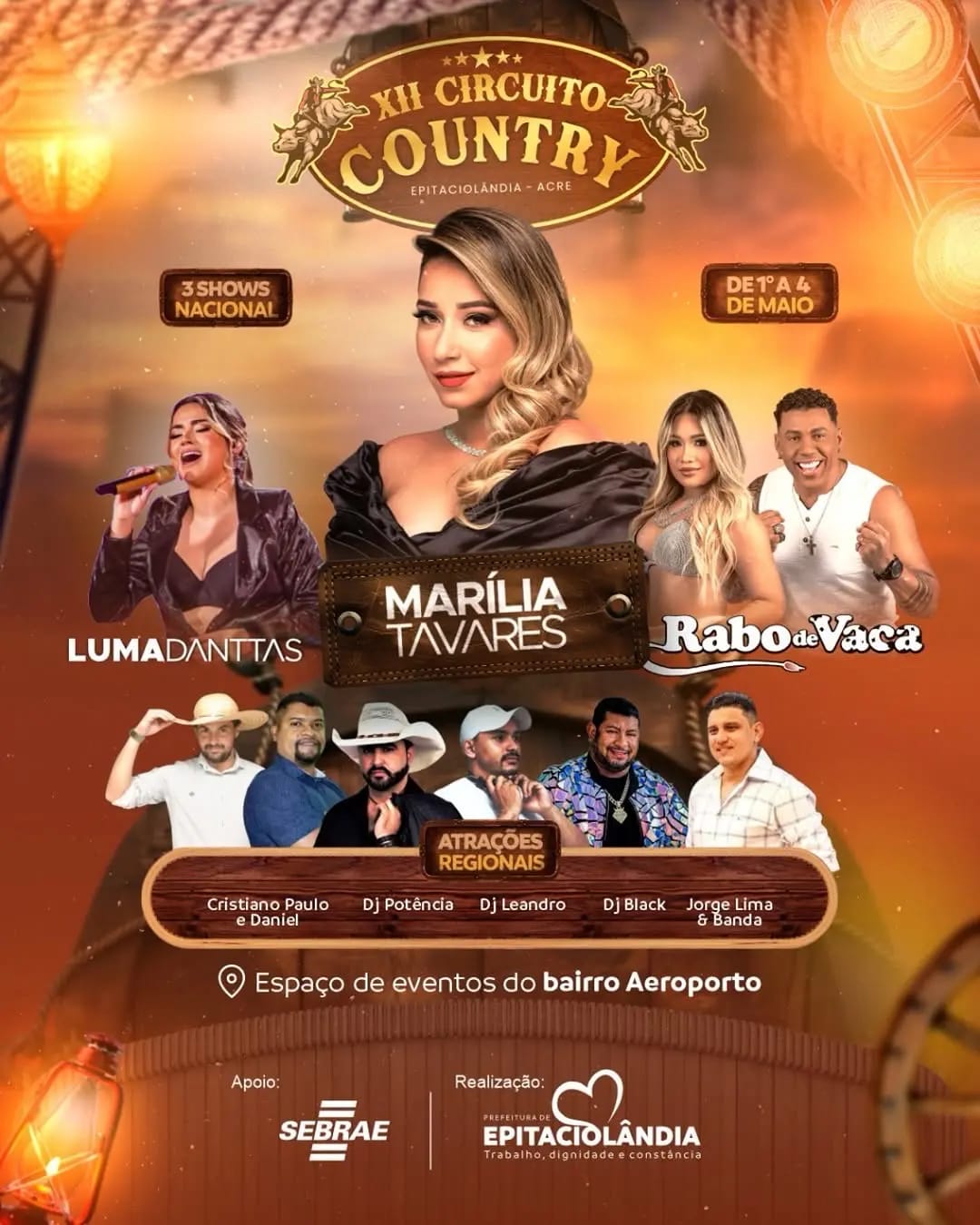 O XII Circuito Country, tradicional evento cultural da cidade de Epitaciolândia, que acontecerá entre os dias 1 a 4 de maio, irá receber três atrações nacionais, Marília Tavares, de Roraima; Luma Danttas do Pará; e a banda Rabo de Vaca, do Amazonas.