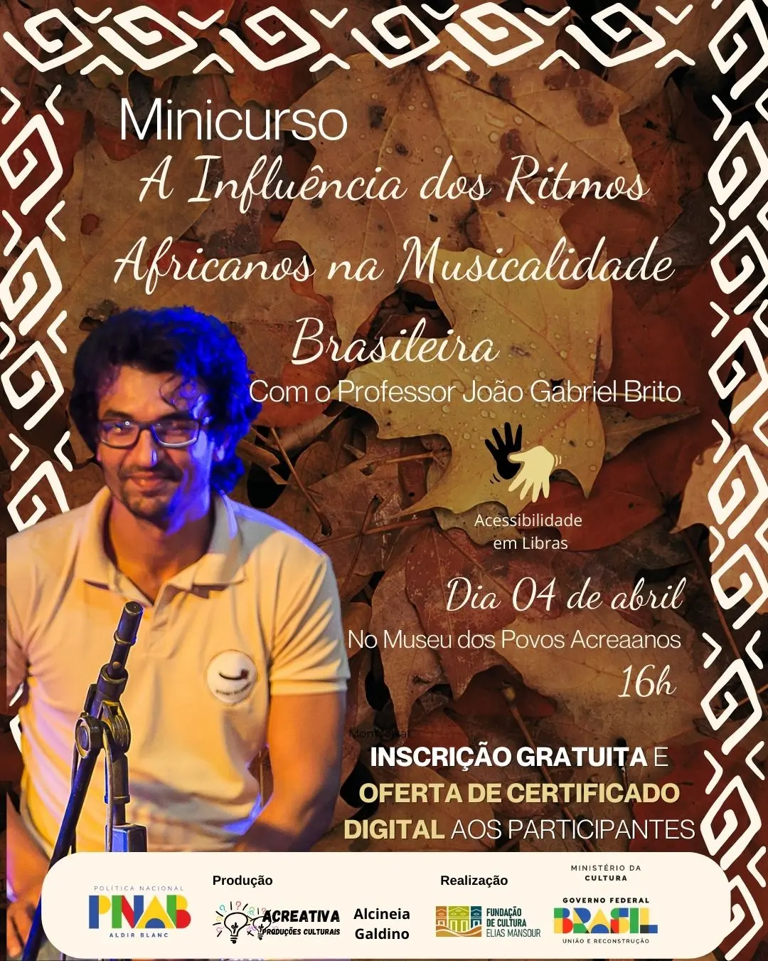No dia 4 de abril, às 16h, o Museu dos Povos Acreanos será palco de uma palestra imperdível com o professor e músico João Gabriel Brito. O evento, intitulado “A Influência dos Ritmos Africanos na Musicalidade Brasileira”, visa explorar as profundas conexões entre a musicalidade africana e os ritmos que formam a identidade musical do Brasil.