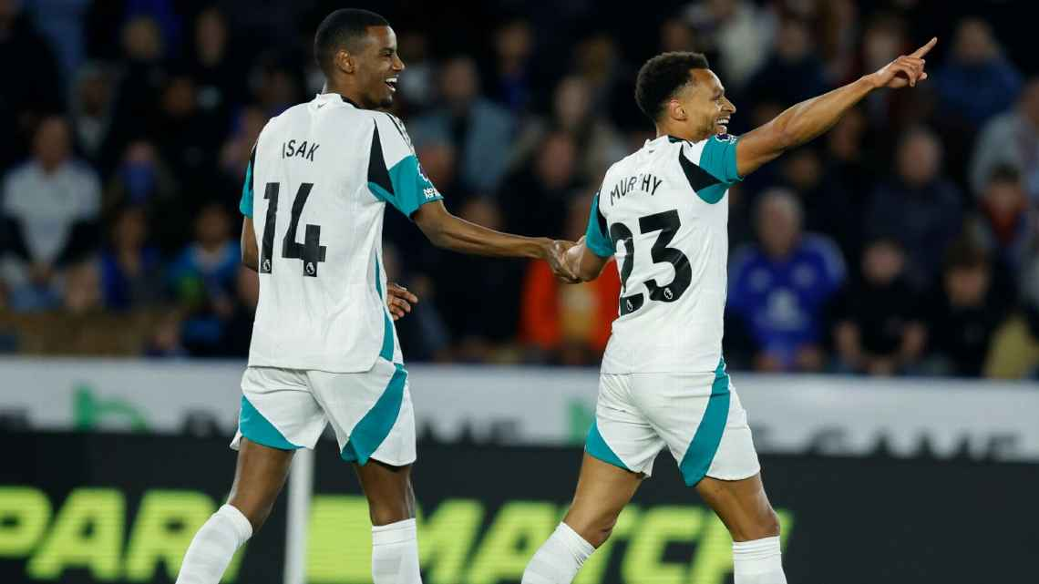 Isak e Murphy comemoram gol do Newcastle contra o Leicester Nigel French/Sportsphoto/Allstar via Getty Images