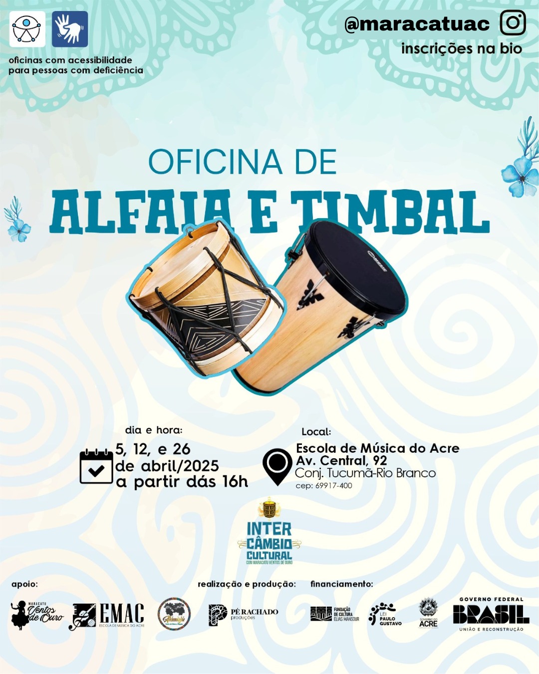 A iniciativa faz parte do projeto Intercâmbio Cultural, que ocorreu no início de fevereiro em Salvador (BA), e visa proporcionar um espaço de aprendizado e valorização dos instrumentos de percussão, como a alfaia e o timbal. A oficina será realizada na Escola de Música do Acre, localizada na Avenida Central, 92, no Conjunto Tucumã.