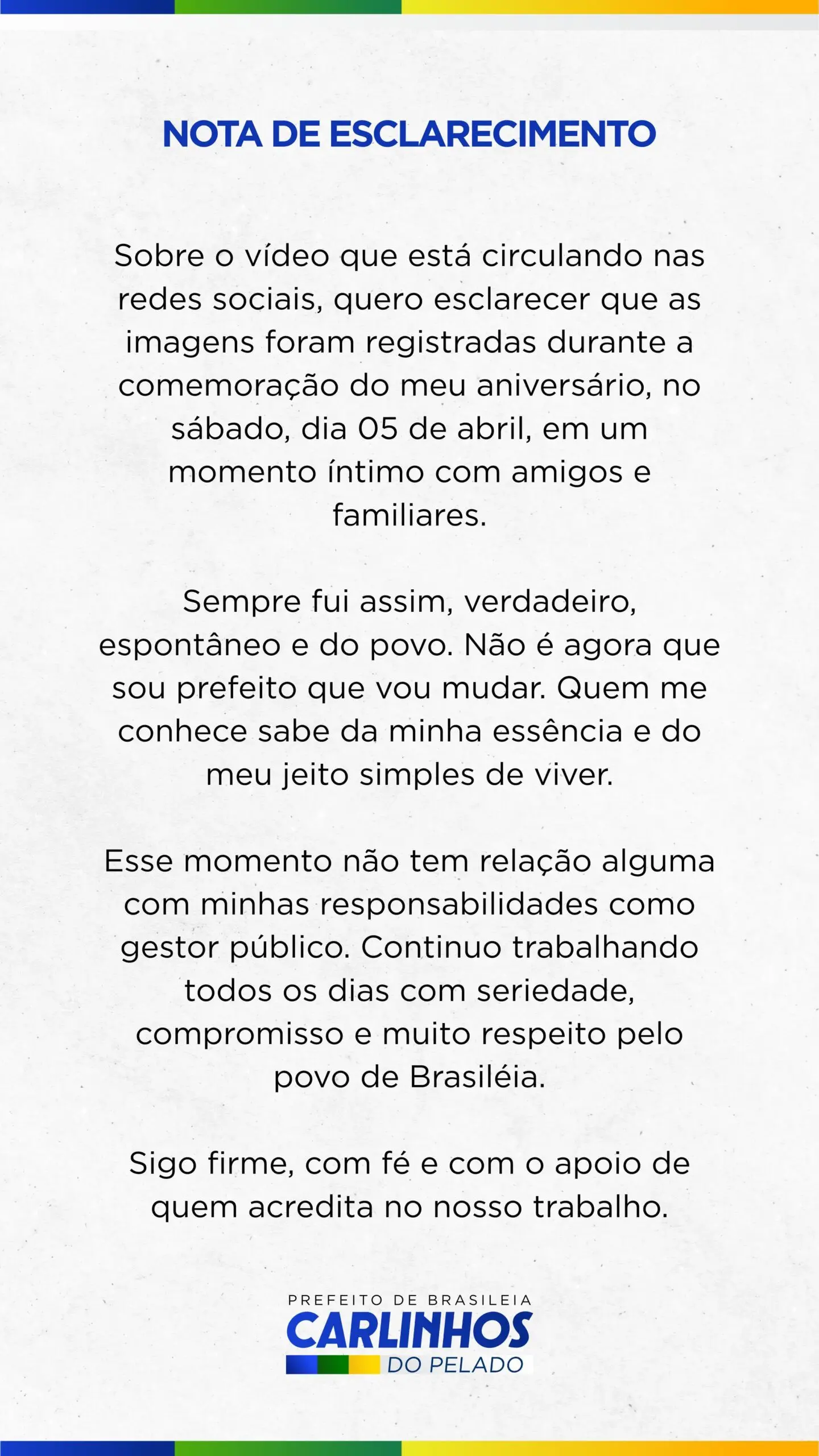 O prefeito ainda destacou que o momento retratado no vídeo não tem qualquer ligação com suas atribuições como gestor público. Segundo ele, seu compromisso com a administração de Brasiléia permanece firme e com responsabilidade.