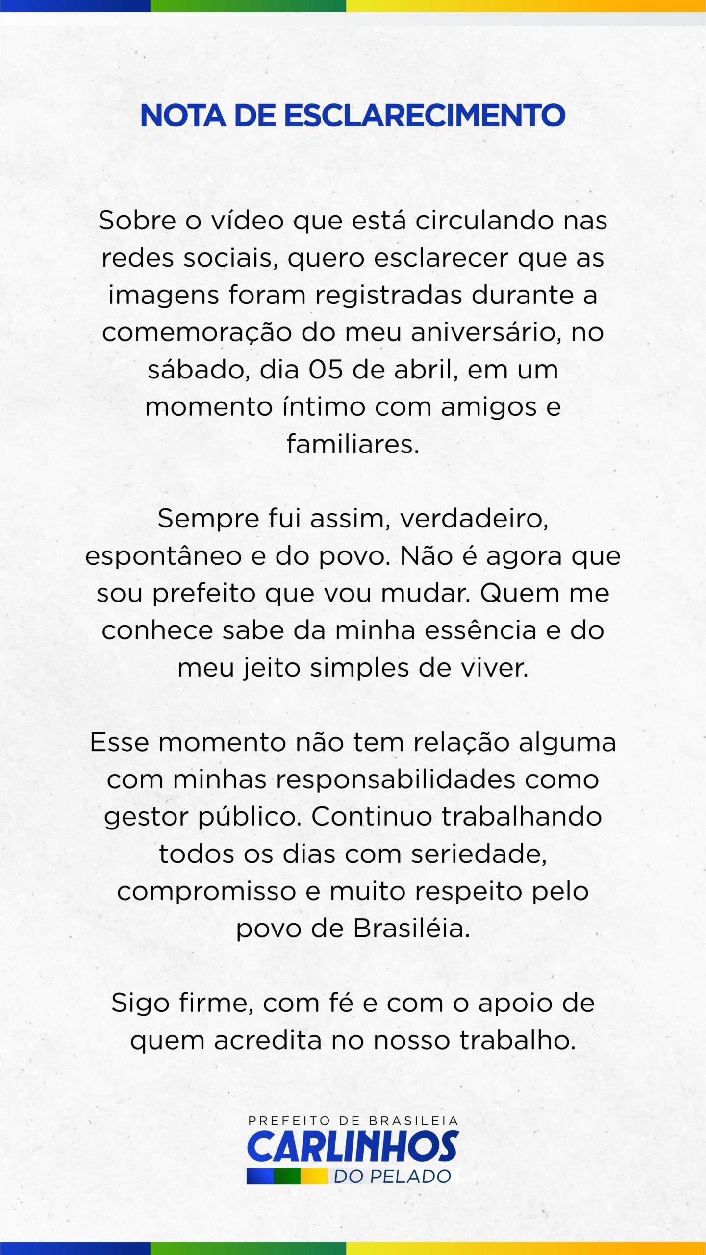 O prefeito ainda destacou que o momento retratado no vídeo não tem qualquer ligação com suas atribuições como gestor público. Segundo ele, seu compromisso com a administração de Brasiléia permanece firme e com responsabilidade.