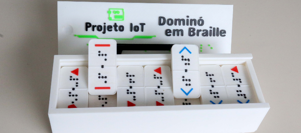 O dominó em braile é uma adaptação do dominó padrão, consistindo em 24 peças produzidas em impressora 3D, com acrilonitrila butadieno estireno (ABS, na sigla em inglês).