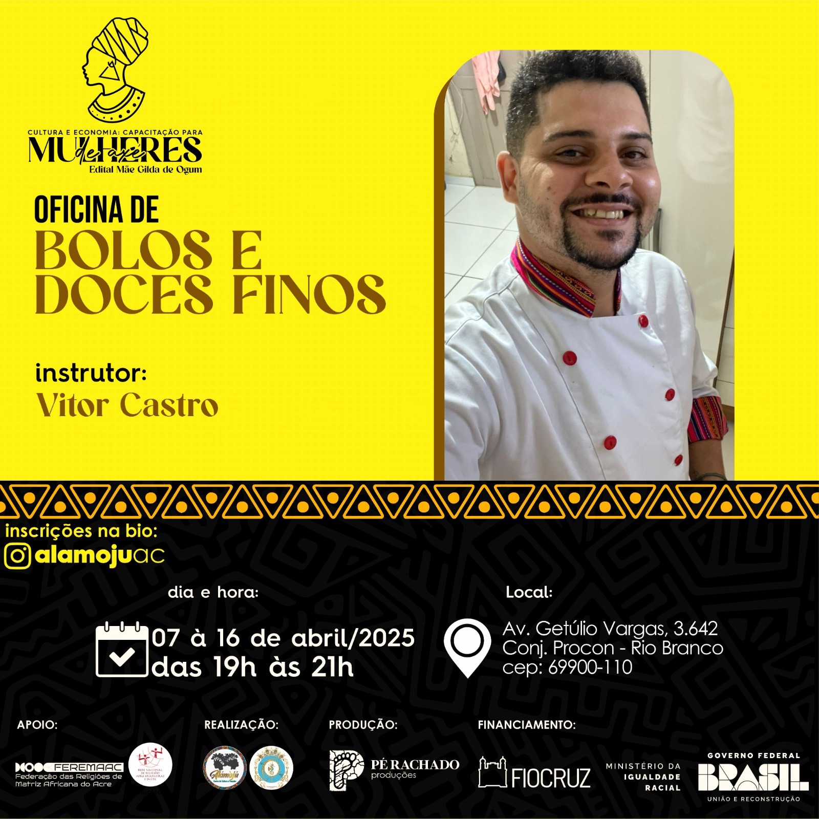 Oficina de Bolos e Doces Finos, com o instrutor Vitor Castro, que ensinará as participantes a prepararem massas, cremes, recheios e técnicas de decoração voltadas para festas de Orixás, valorizando a tradição e o empreendedorismo feminino dentro dos terreiros. As aulas serão ministradas de 07 a 16 de abril, das 19h às 21h, na Av. Getúlio Vargas, 3.642, Conjunto Procon. Acesse aqui para se inscrever acesse.