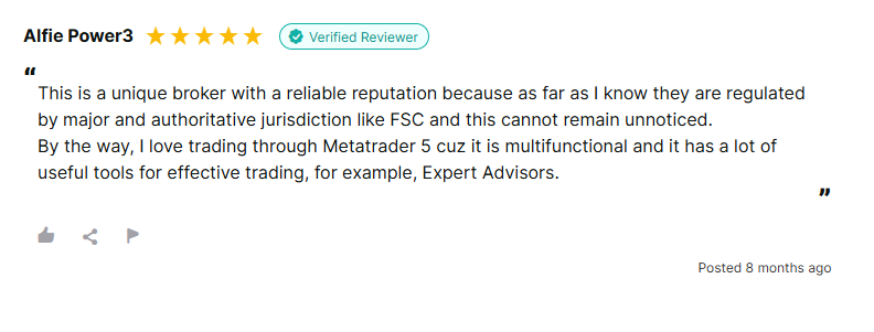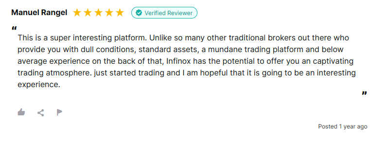 Em vez de uma avaliação padrão da INFINOX Forex, pode ser mais interessante destacar uma que elogie a “atmosfera de negociação cativante”. O revisor aprecia como a corretora oferece boas oportunidades de ganhos para seus clientes.