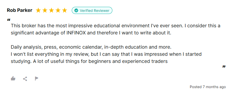 Em vez de uma avaliação padrão da INFINOX Forex, pode ser mais interessante destacar uma que elogie a “atmosfera de negociação cativante”. O revisor aprecia como a corretora oferece boas oportunidades de ganhos para seus clientes.