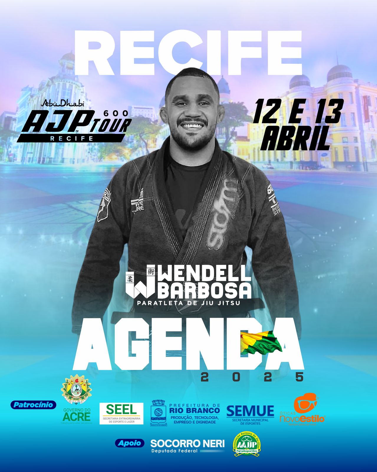O secretário de Esporte de Rio Branco, Wendel Barbosa, vai disputar o torneio de jiu-jitsu, Abu Dhabi AJP Tour, em Recife, que acontece nos dias 12 e 13 de abril. O atleta vai lutar em três categorias, com kimono, no-gi (sem kimono) e parajiu-jitsu.