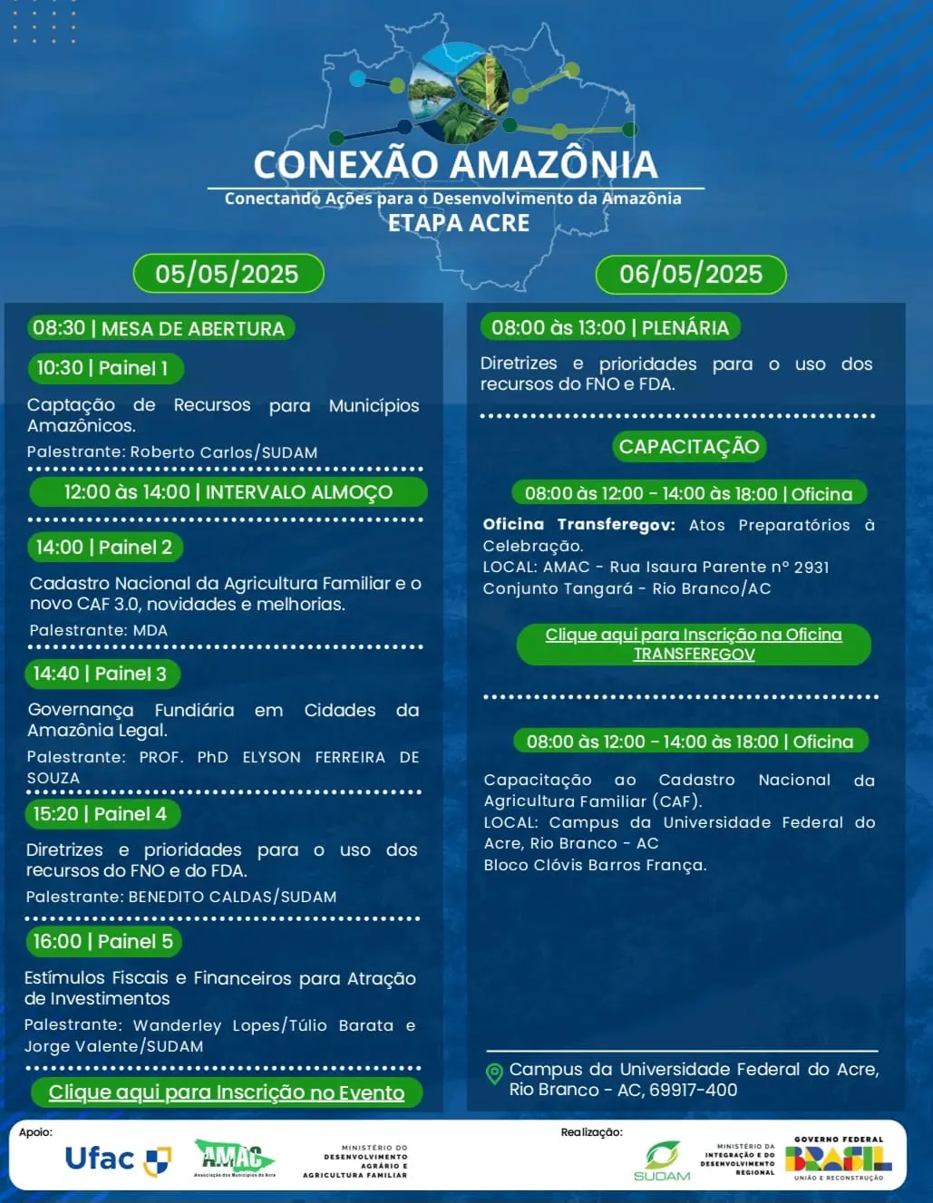 De acordo com Machado, a etapa Acre do “Conexão Amazônia” reforça o compromisso da Sudam com o desenvolvimento da Amazônia e dos municípios acreanos, garantindo que gestores e técnicos tenham as ferramentas necessárias para impulsionar suas cidades. Veja a seguir, a programação do evento: