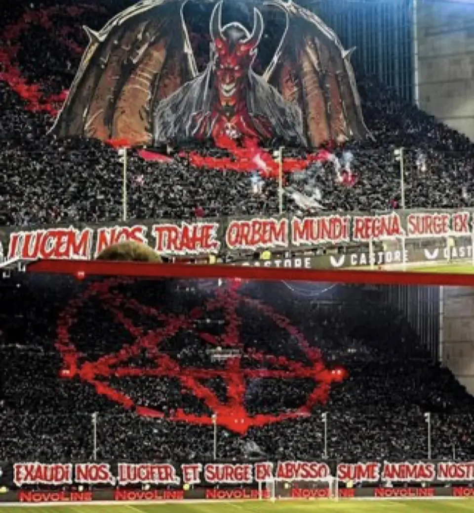 Sob o mosaico, os torcedores ergueram faixas com a seguinte frase, em latim: – Atrai-nos à luz, reina sobre o mundo, ergue-te do abismo. Ouve-nos, Lúcifer, e ergue-te do abismo, leva nossas almas.