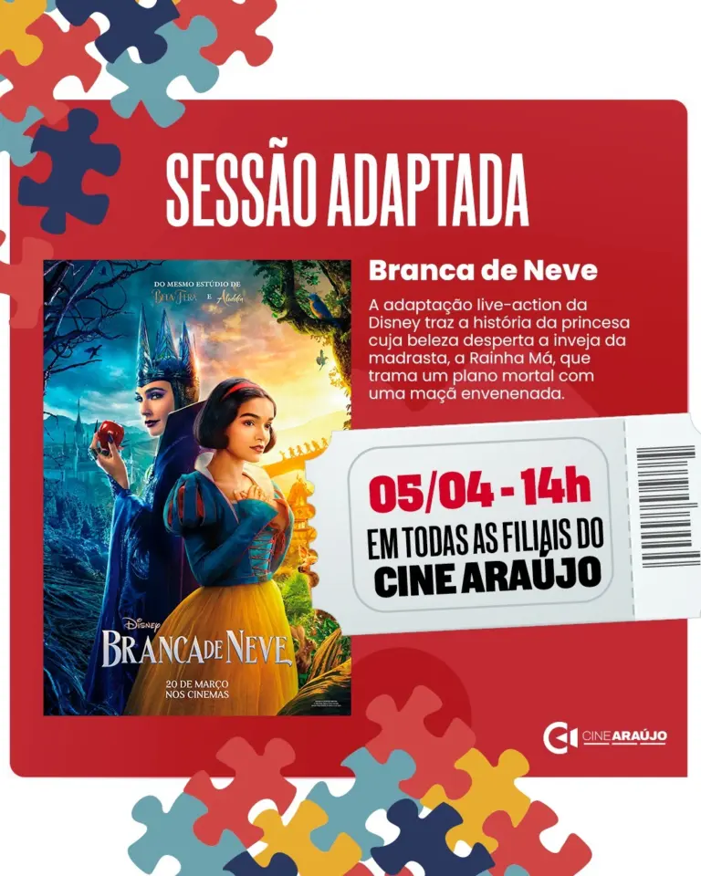 Como parte da programação especial do mês pela conscientização do autismo, o Cine Araújo anuncia seu compromisso com a inclusão ao promover, durante todos os sábados, a Sessão Adaptada Especial. Voltada para pessoas com Transtorno do Espectro Autista (TEA) e outras sensibilidades, a sessão conta com ambiente mais confortável, luzes acesas, som reduzido, temperatura controlada e exibição sem trailers ou propagandas. A primeira sessão acontece no dia 5 de abril, às 14h, com a versão live-action de Branca de Neve, clássica história da princesa que enfrenta a inveja da Rainha Má e encontra aliados inesperados para escapar do perigo.