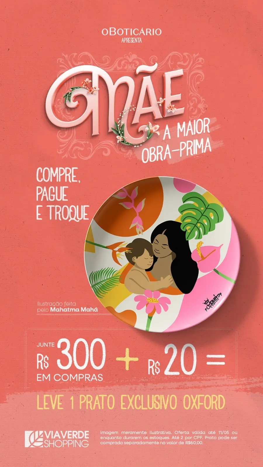 De 1º a 11 de maio, ao juntar R$ 300 em compras + a quantia de R$ 20, o cliente levará para sua mãe um prato exclusivo da Oxford, com ilustração assinada pelo artista Mahatma Mahá, uma verdadeira obra de afeto que transforma gratidão em arte. As trocas serão realizadas no ponto de atendimento dentro do shopping montado em frente à loja Avenida, até durarem o estoque.