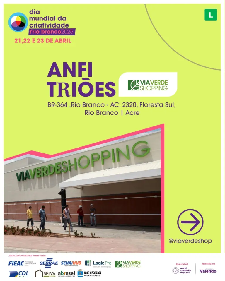 O Via Verde Shopping, endereço das melhores marcas e referência em conforto e experiência para o público acreano, será um dos espaços oficiais do Dia Mundial da Criatividade, com atividades programadas exclusivamente no dia 21 de abril. O festival, que acontece de 21 a 23 de abril na capital, faz parte do maior movimento colaborativo de criatividade do mundo, realizado simultaneamente em mais de 65 cidades em todo o país.