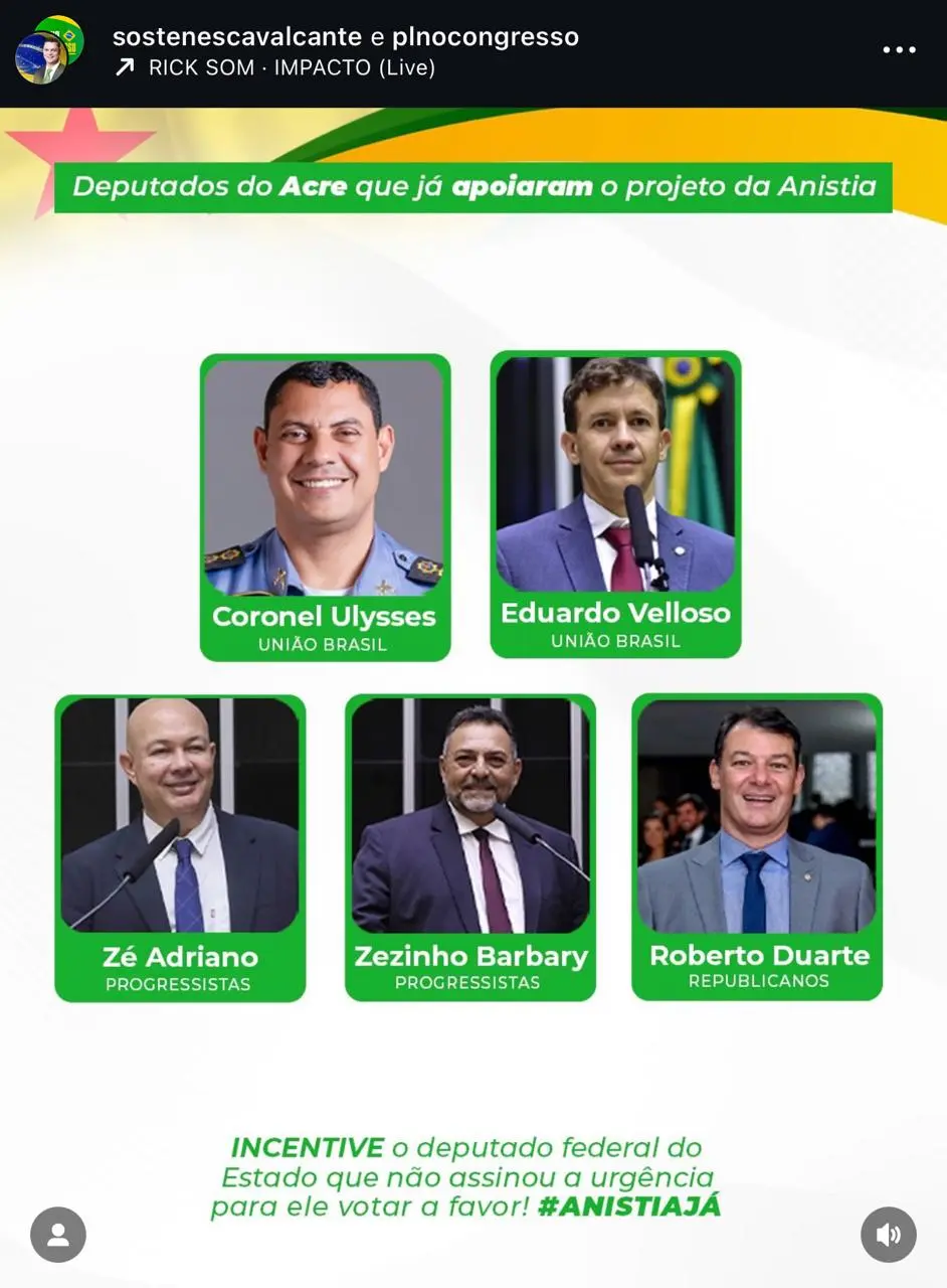 O deputado Zé Adriano (Progressistas-AC) juntou-se à parte da bancada acreana na Câmara Federal que assinou o pedido de urgência proposto pela oposição sob liderança do PL para a tramitação e posterior votação do projeto de lei que estabelece anistia para os envolvidos e presos nos atos violentos na Praça dos Três Poderes, em Brasília, no dia 8 de janeiro de 2023.