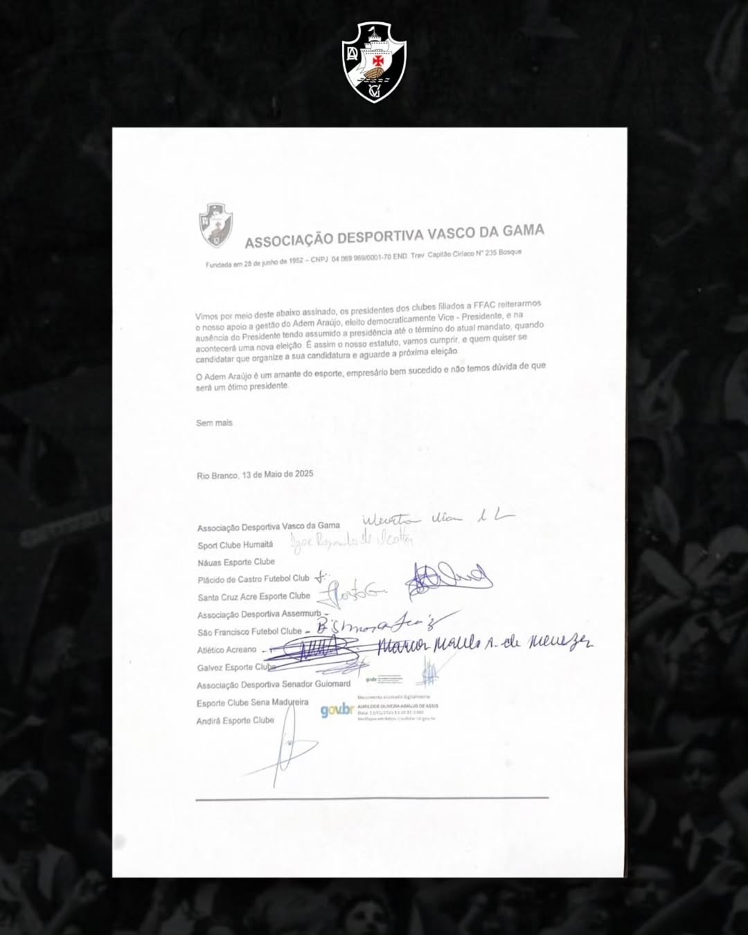 Em meio a disputas internas na Federação de Futebol do Acre (FFAC), 11 clubes do estado divulgaram apoio conjunto a Adem Araújo, atual presidente da entidade. A manifestação foi tornada pública por meio de uma nota oficial assinada pelo presidente do Vasco da Gama-Acre, Weverton Viana da Silva, que rechaça qualquer tentativa de deslegitimar a liderança de Araújo.