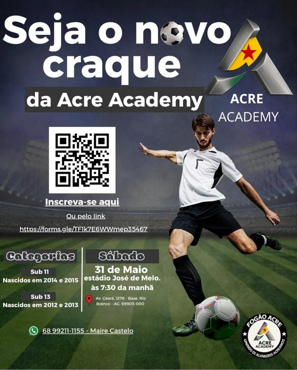 A Acre Academy promove neste sábado, 31, a partir das 7h30, no estádio José de Melo, uma seletiva para descobrir novos talentos do futebol nas categorias Sub-11 e Sub-13. Para participar, os garotos devem comparecer com o material de jogo completo. Atualmente 50 crianças já estão inscritas. Não existem taxas para participar do evento.