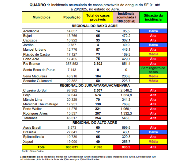 De acordo com o boletim, a maior parte dos municípios do Acre está classificada como de alta incidência, totalizando 15, dos 22. Apenas alguns municípios, como Acrelândia, Plácido de Castro, Senador Guiomard, Brasileia e Santa Rosa do Purus (este último sem registro de casos), apresentam índices considerados baixos ou médios.