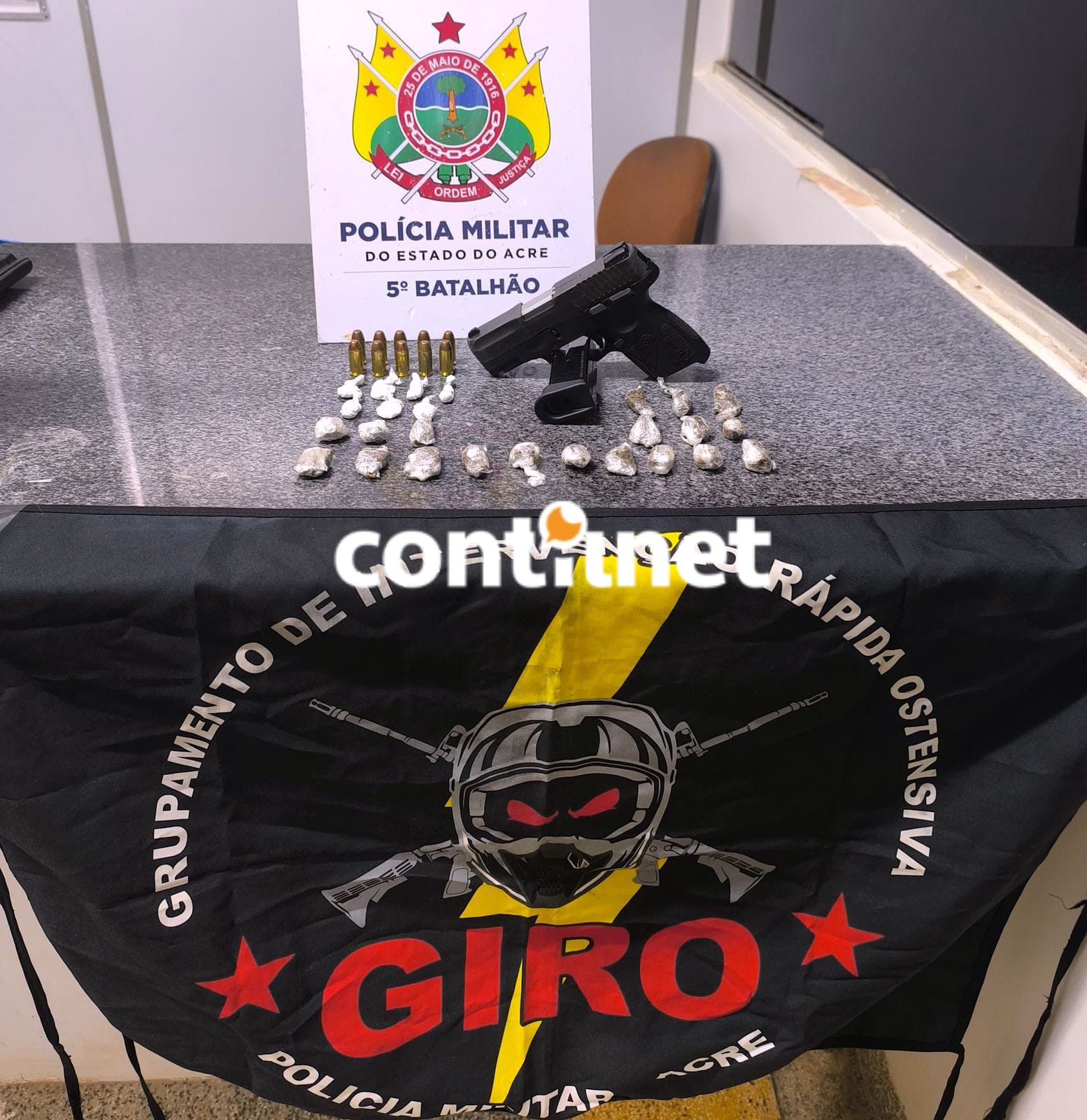Um adolescente foi apreendido por tráfico de drogas e posse ilegal de arma de fogo na tarde desta quarta-feira (7), no bairro Aeroporto, em Epitaciolândia. A ação foi realizada por policiais militares do Grupo de Intervenção Rápida e Ostensiva (GIRO), após denúncia anônima que indicava atividade suspeita relacionada ao tráfico na região.