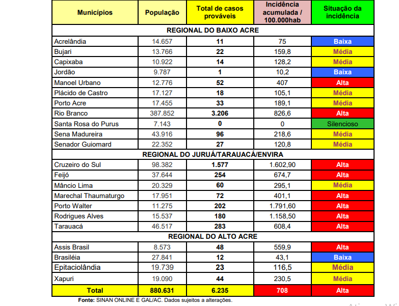 O total de casos prováveis acumulados chega a 6.235, com uma incidência média de 708 casos por 100 mil habitantes, o que coloca o Acre em estado de alerta epidemiológico.